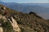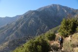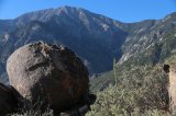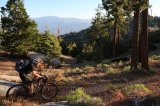 Réveil à 4h30 pour profiter de la relative fraîcheur matinale... Quel bonheur de se lever en sachant que la journée commence par une descente sur single de presque 2000 mètres de dénivelé... D'autant plus que la descente est fantastique, mise à part une section d'une trentaine de minutes très griffante... Nous passons des forêts de cyprès et pins pandarosa au bush désertique. La section finale qui virevolte entre les gros blocs granitiques blancs restera dans les annales... Arrivés dans la plaine de Banning, la chaleur est accablante. Finn s'accroche, sensible aux fournaises... Une vingtaine de kilomètres en faux plat montant parallèle à la highway, et nous voilà enfin à Banning. Pas jojo... La caricature d'une ville américaine sans cachet avec des commerces qui se succèdent le long d'une large avenue principale. Sans que nous n'ayons rien demandé, une femme s'arrête avec sa voiture et nous tend trois bouteilles d'eau fraîche. Un geste qui reflète parfaitement l'accueil des américains depuis le début de notre voyage. Desséché, nous trouvons enfin un magasin où acheter des fruits et des légumes et allons siester dans un des rares parcs de la ville. S'en suit un arrêt au Starbuck Café où un gars nous branche pour en savoir plus sur notre voyage. Nous sommes toujours étonné de voir avec quelle facilité les ricains entrent en contact avec des gens qu'ils ne connaissent pas. Nous devrions en prendre de la graine en France... Après avoir tchatché avec des skaters locaux, nous quittons Banning en fin d'après midi avec des températures plus humaines. Remontée d'un long canyon dont la largeur du lit laisse imaginer la violence des orages ... Nous nous rapprochons des montagnes verdoyantes de la chaîne de San Bernardino et plantons le camp au milieu du canyon.