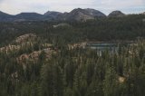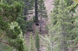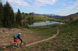 C'est sous une douce lumière que nous démarrons la journée, quelques nuages improbables voilent le ciel. Nous attaquons fort par un single en balcon au-dessus d'un joli lac puis basculons dans une gorge impressionnante aux reliefs volcaniques. Nous rejoignons après quelques montées les aiguilles volcaniques qui se découpaient dans le ciel au couchant hier soir. Progressivement le paysage change, le décor s'ouvre, des sections lunaires dans lesquelles nous roulons sur du sable blanc précèdent de grandes vallées fleuries. Nous avalons le paysage et les kilomètres sur des singles (enfin !) hyper roulants. Nous croisons toujours "fast man" notre marcheur sympathique en route lui aussi pour le Canada. L'événement de la journée est la rencontre avec notre premier ours ! Cherchez la photo ci-dessous ;-) Nous l'observons pendant 10 bonnes minutes alors qu'il est en recherche de bonnes herbes sur le versant en face de nous. Son air débonnaire ne nous fait pas oublier qu'il faut rester prudent… Notre rituel du soir est désormais bien rôdé et nous pendons toujours toute notre nourriture ainsi que dentifrice et pommades dans les arbres. Le bivouac d'aujourd'hui s'annonçait idyllique, perché sur de grandes dalles granitiques, non loin d'une petite rivière… Nos amis les moustiques en ont décidé autrement et nous sommes tous empressés de nous réfugier dans la tente.